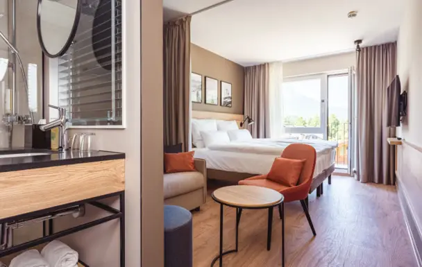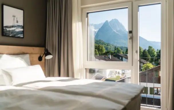 Einschlafen und aufwachen mit Ausblick auf Deutschlands höchste Gipfel – das erleben Sie im aja Garmisch-Partenkirchen.